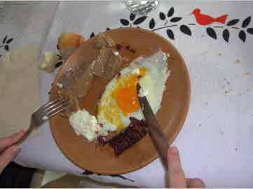Nous les avons invités à dîner à la maison, repas composé d’une " pulenta " (polenta à la farine de châtaigne), avec œuf au plat, " brocciu " (fromage frais au petit lait de brebis chauffé), et " figatellu " (sorte de saucisse au foie de porc). Dans l’assiette : pulenta (haut gauche), œuf, brocciu (en bas à gauche) et figatellu (en bas). Remarque : la recette de la polenta sera décrite prochainement. |