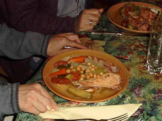Le soir nous sommes à nouveau réunis devant des assiettes… un couscous, qui n’est pas traditionnel de Corse, comme chacun le sait, mais d’Afrique du Nord. C’est un plat qui devient assez habituel en repas de fête, ce qui montre l’influence sur notre table des fortes migrations depuis l’Algérie, le Maroc, la Tunisie à partir des années 1960 et plus. |