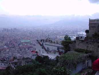 Très belle vue des hauteurs. Dommage, la brume cache le Vésuve que l'on devine à droite. Le soir, nous avons droit aux pâtes aux fruits de mer. Le contenu, la préparation, sont semblables à ce qui se fait chez nous. Mais le goût est différent. Nous n’avons pas encore le savoir-faire de plusieurs générations d’amateurs de pâtes ! |